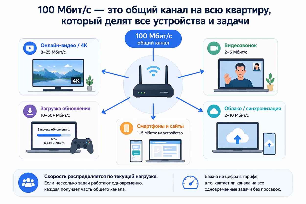 100 Мбит/с — это не скорость для одного устройства, а общий канал, который в квартире делят все активные процессы. Если одновременно работают телевизор, ноутбук, смартфоны, приставка, камеры и облачное хранилище, доступная скорость распределяется между ними по текущей нагрузке, а не закрепляется за каждым устройством отдельно.
